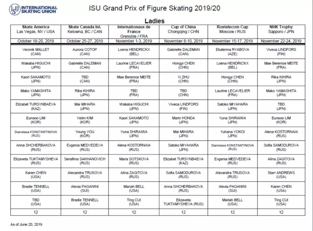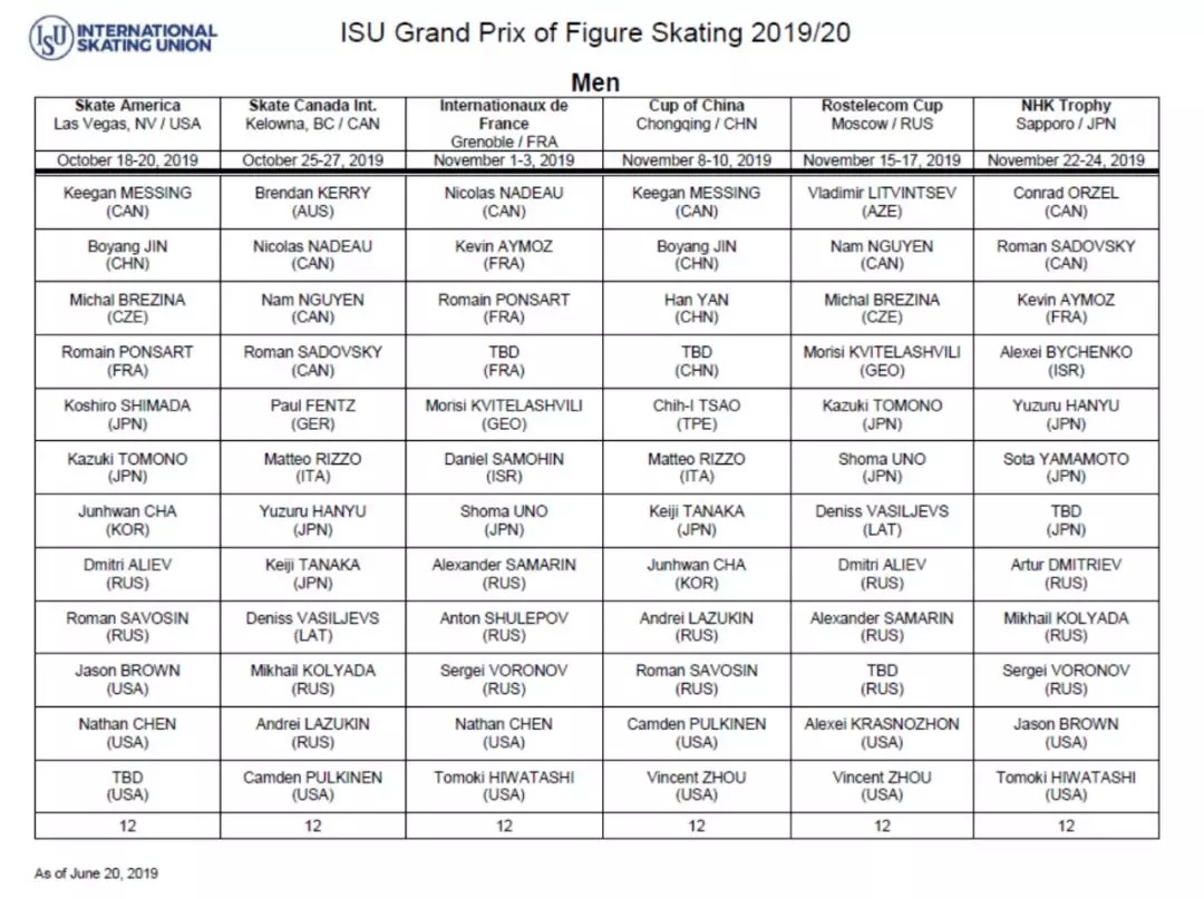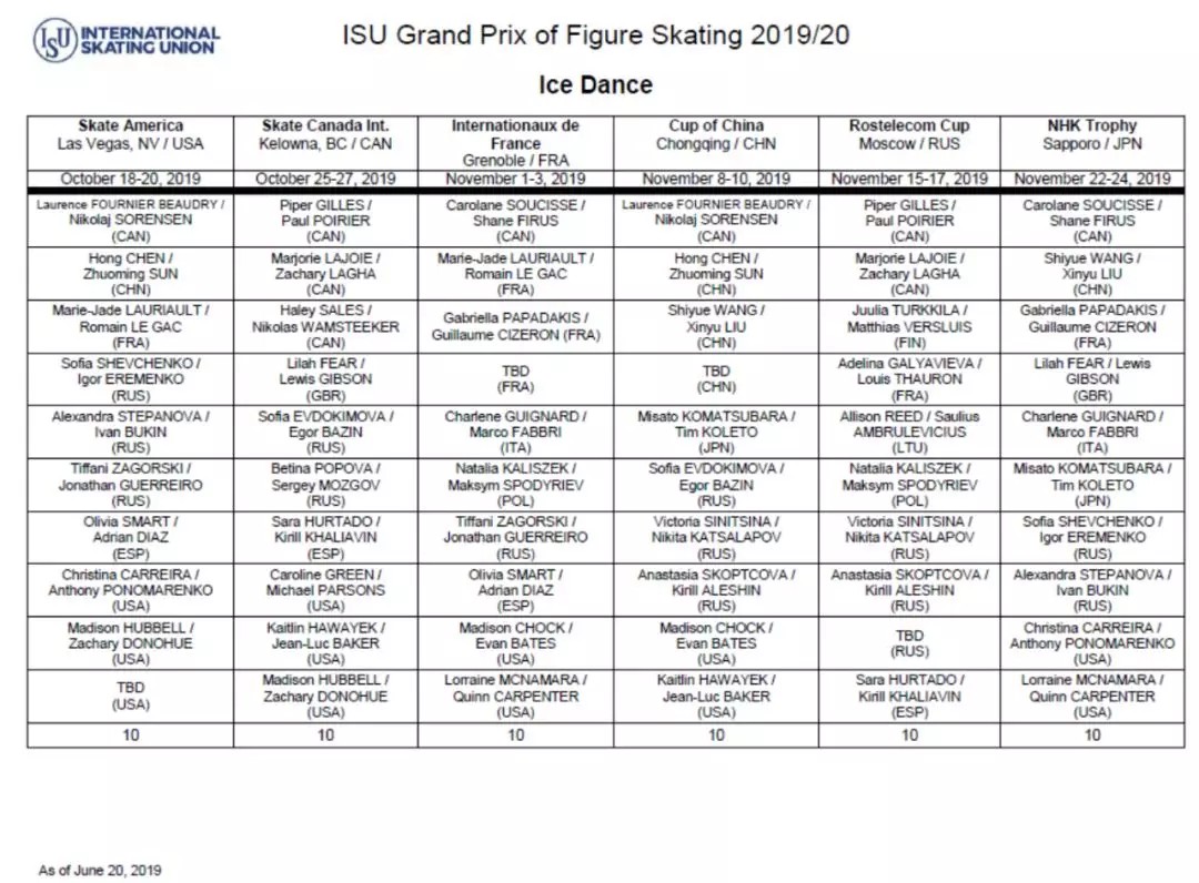 国际滑联公布2019/20赛季花滑大奖赛名单